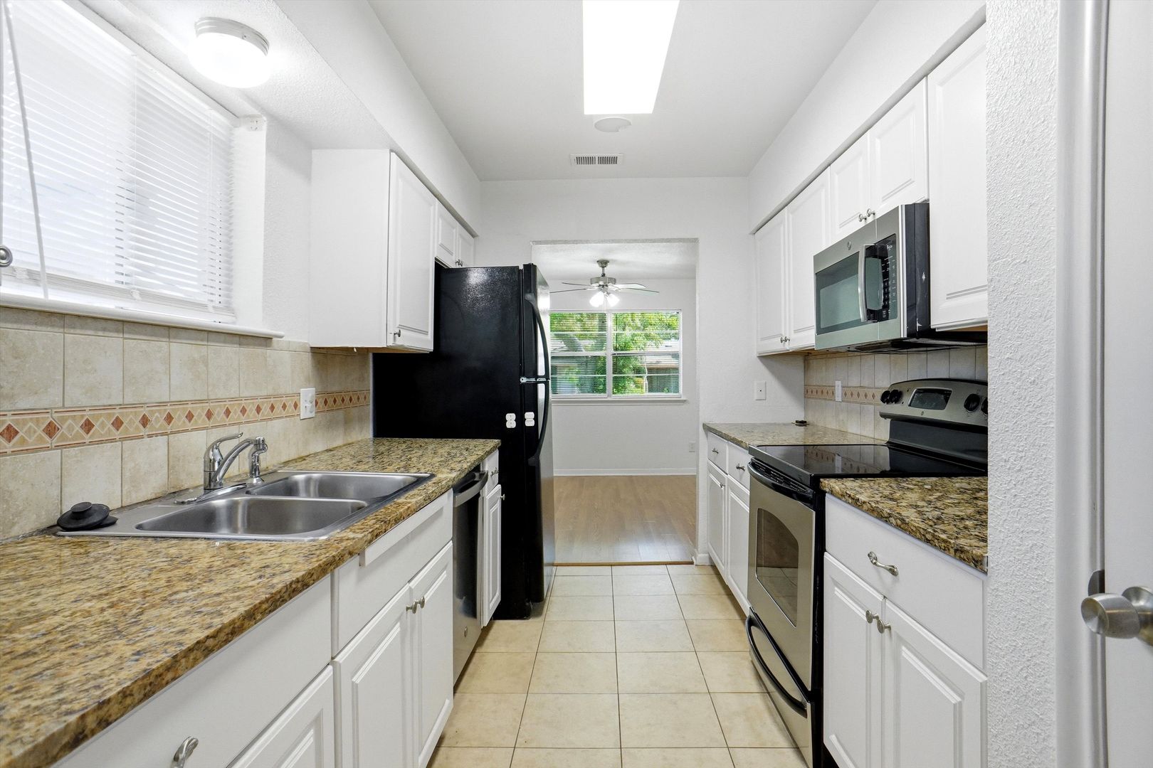 The kitchen and living areas provide a comfortable setting for everyday living and entertaining. In-unit laundry with washer and dryer adds convenience, while central air conditioning and gas heating ensure year-round comfort. The home also includes a detached garage with additional parking.